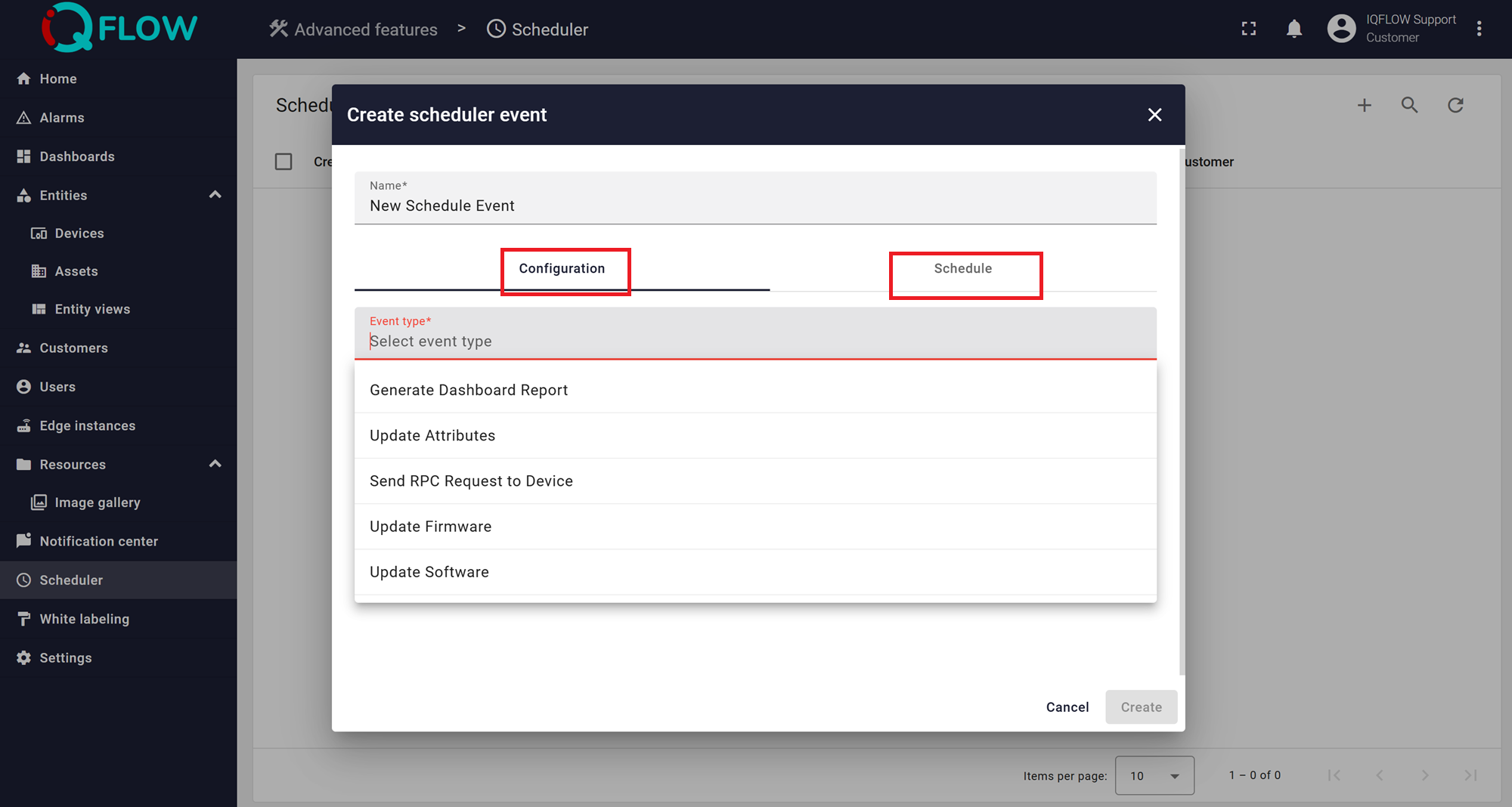 Scheduler event edit dialog consist of two forms Configuration and Schedule.