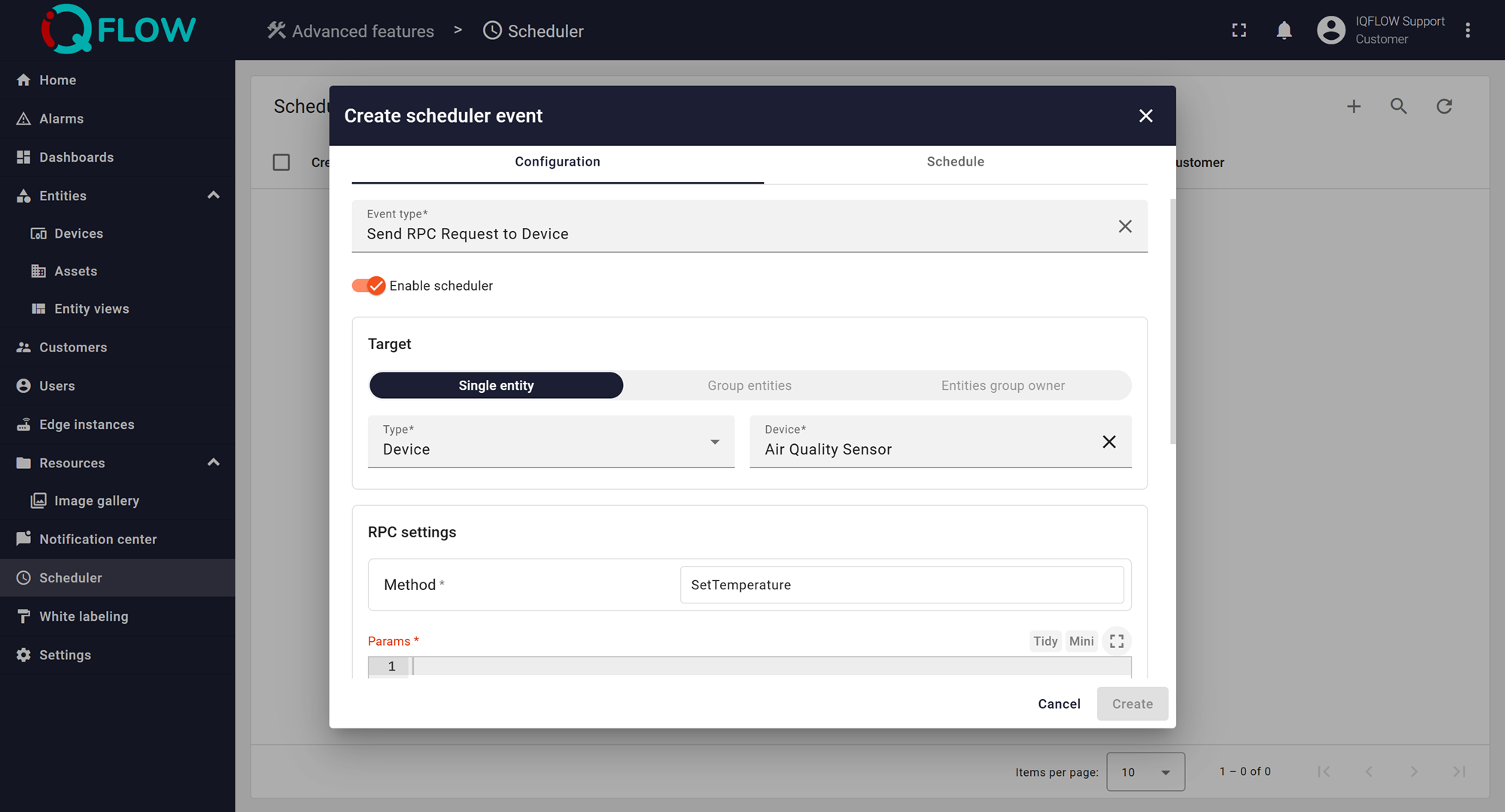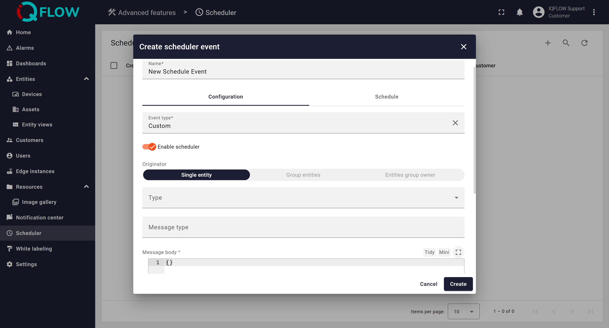- Originator - message originator, can be Single entity (ex. Device, Asset etc.) or Group of entities. If not specified, scheduler event entity itself will be considered as originator.