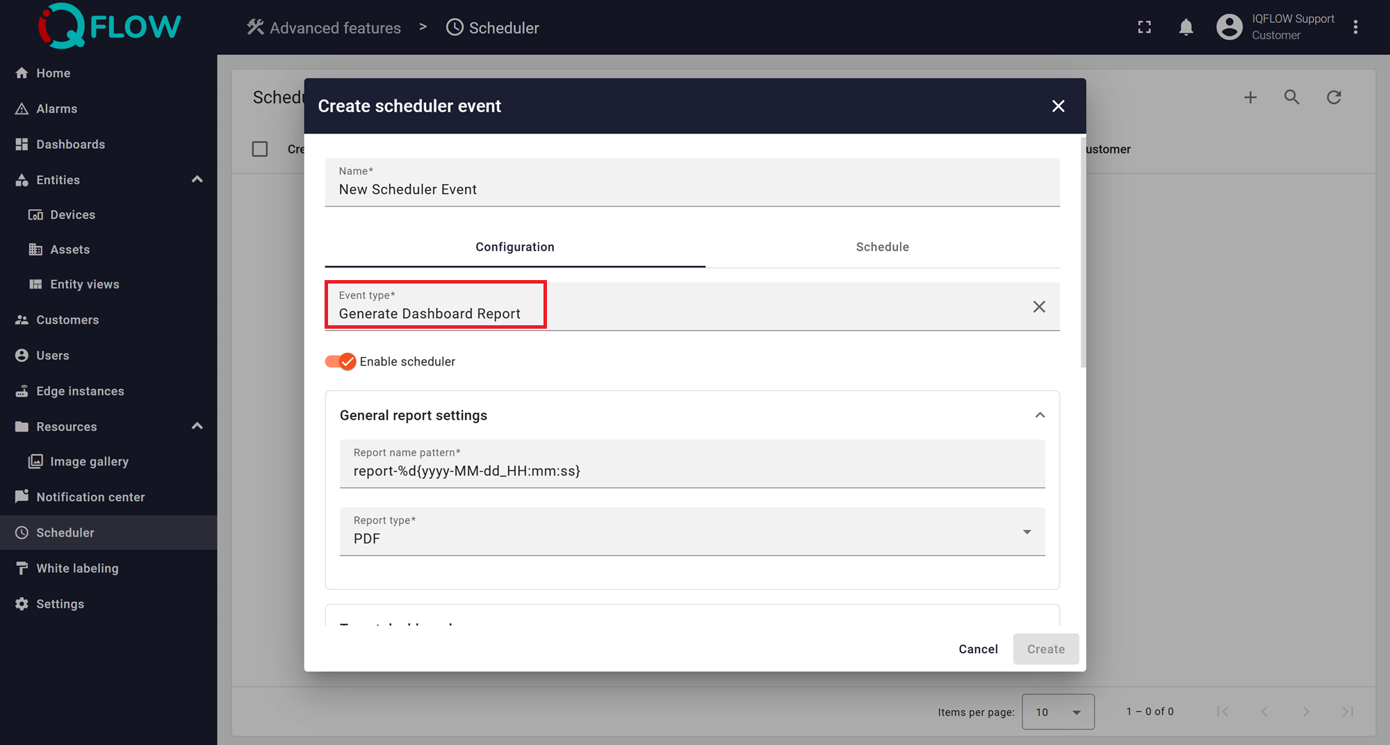 Allows to schedule dashbaord reports generation in PDF, PNG or JPEG.