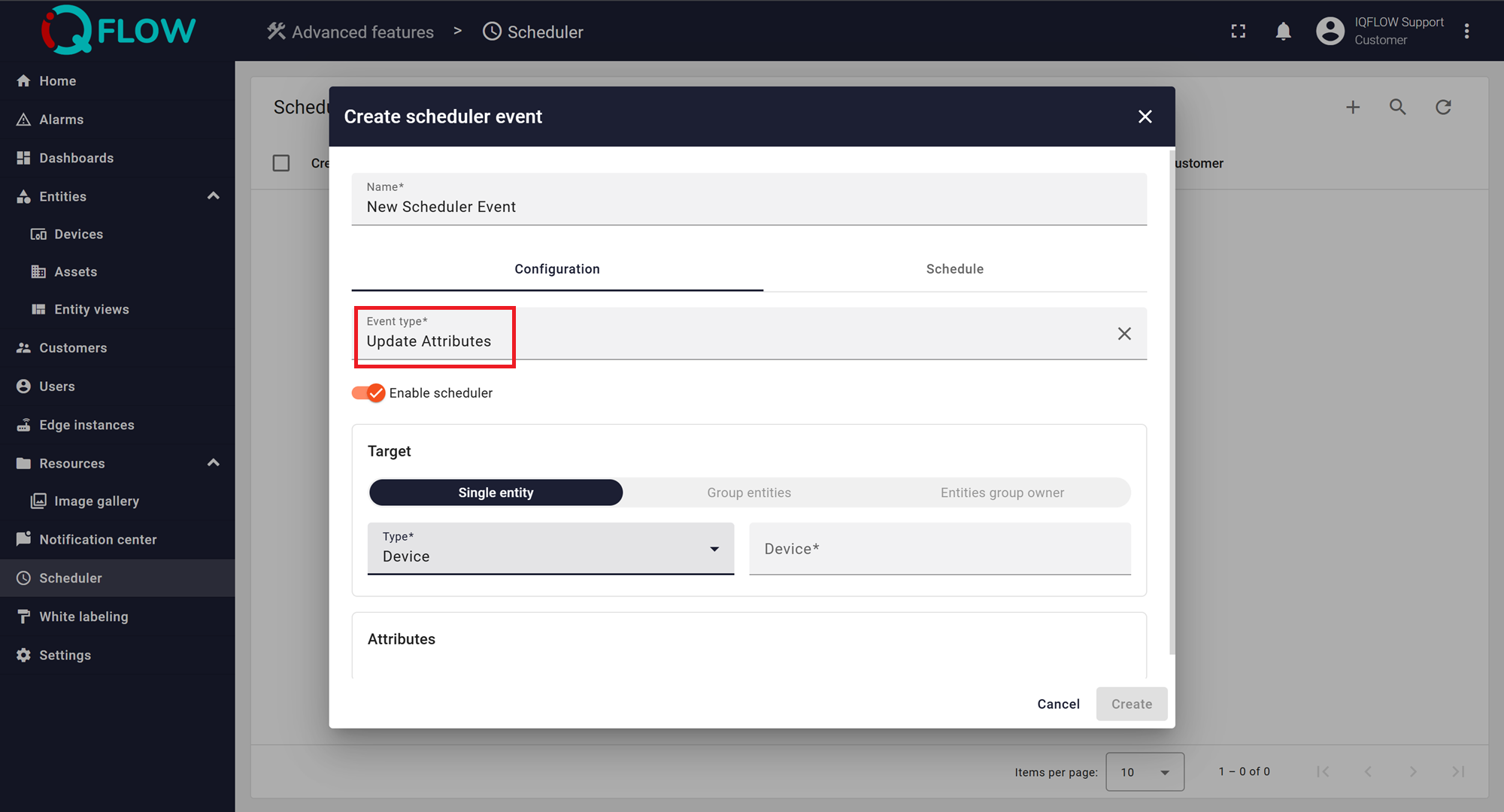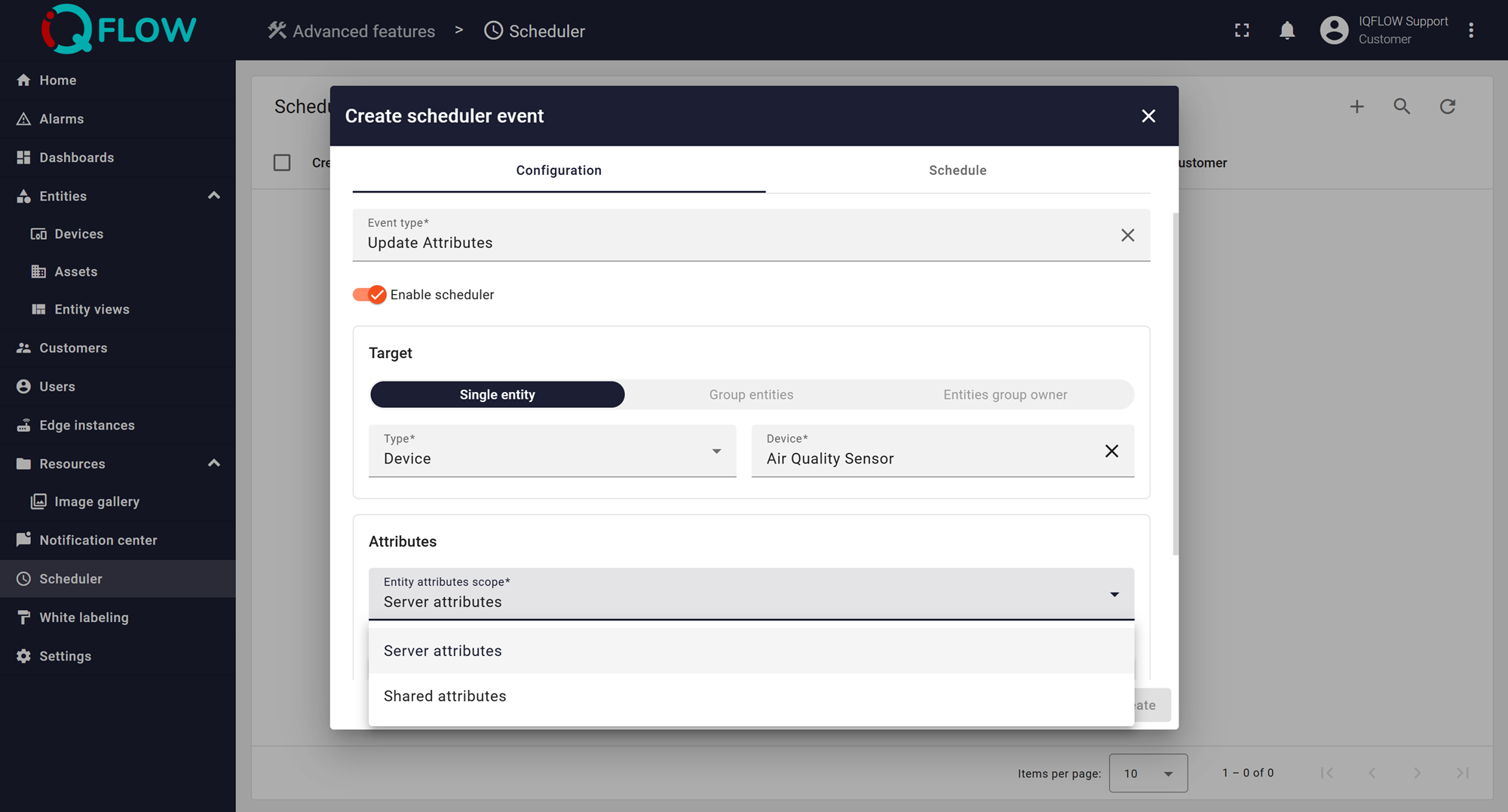 - Entity attributes scope - scope of updated attributes. Can be selected if Device entity type is specified in Target. Can be either Server attributes or Shared attributes. For all other entity types Server attributes scope is used.