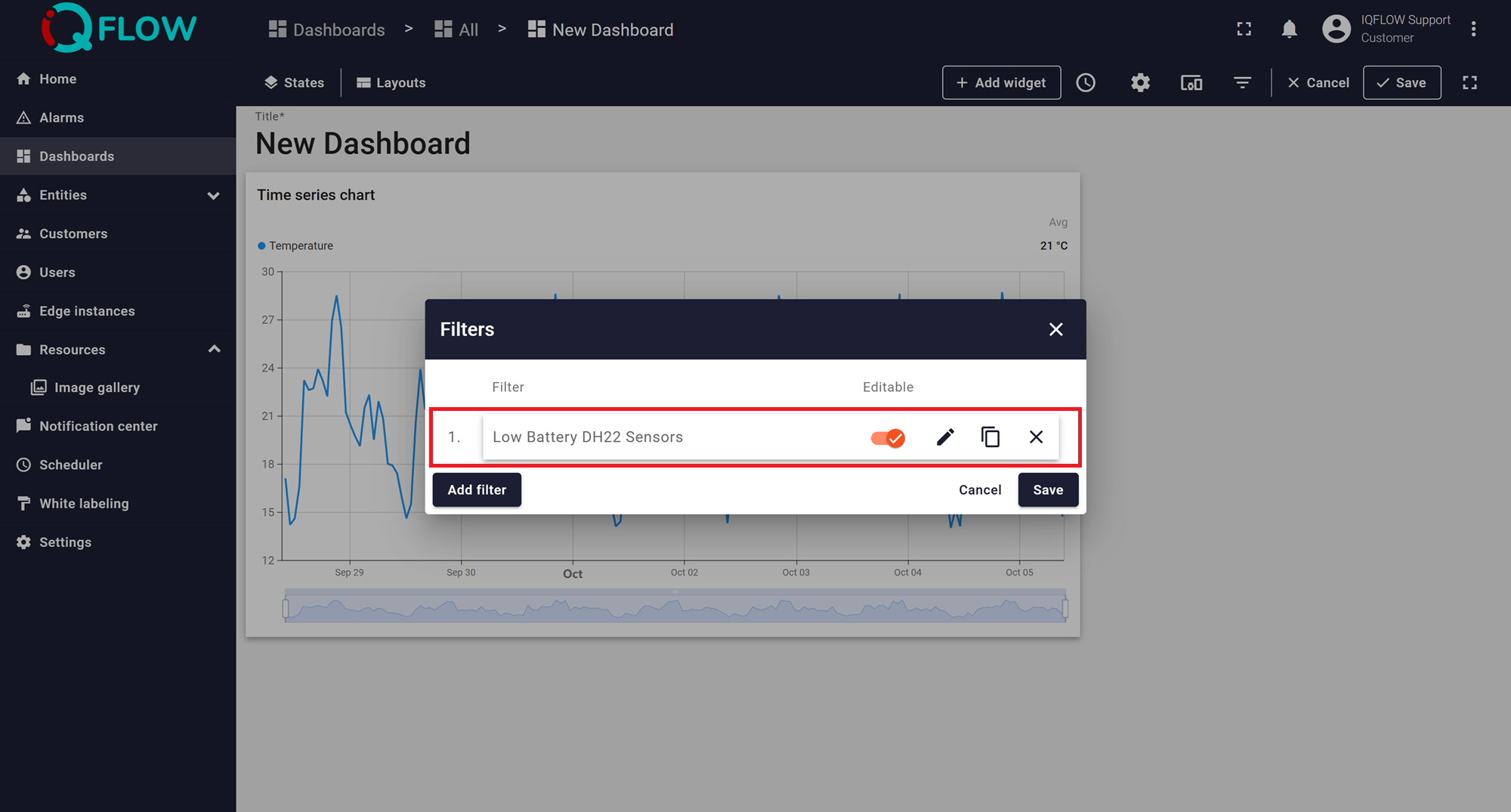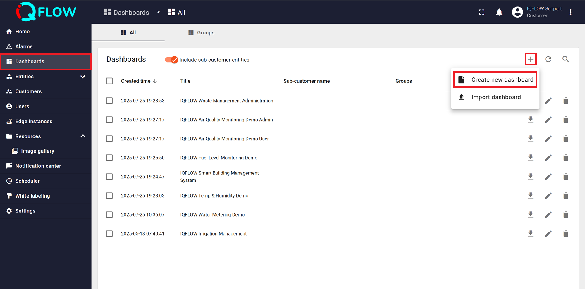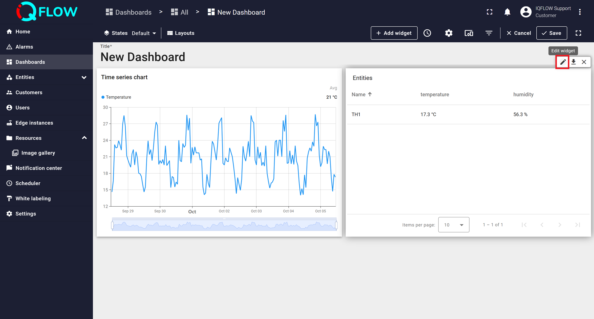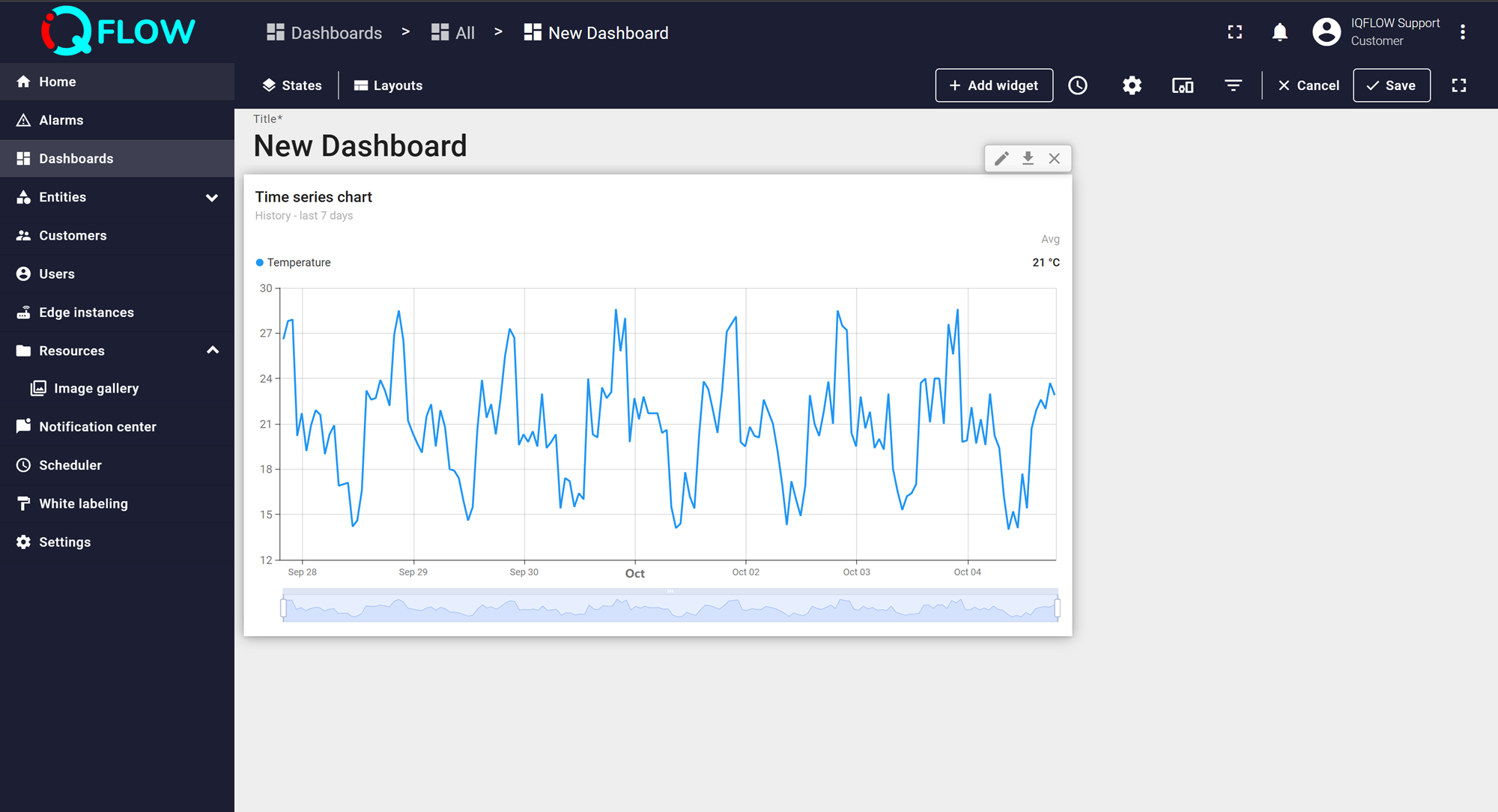 IQFLOW offers a powerful feature – the ability to create and customise interactive visualisations, also known as dashboards. These dashboards are instruments for monitoring and managing your data and devices efficiently. With IQFLOW dashboards, users can adapt interfaces to their specific needs, making it easier than ever to inspect their IoT devices and data. What’s brilliant is that each dashboard can be populated with numerous widgets, offering flexibility and customisation. These dashboards aren’t limited to a single data source; they can display data from various entities, including devices, assets, and more. Plus, you can assign dashboards to specific customers, ensuring that the right individuals or teams have access to the data they need.