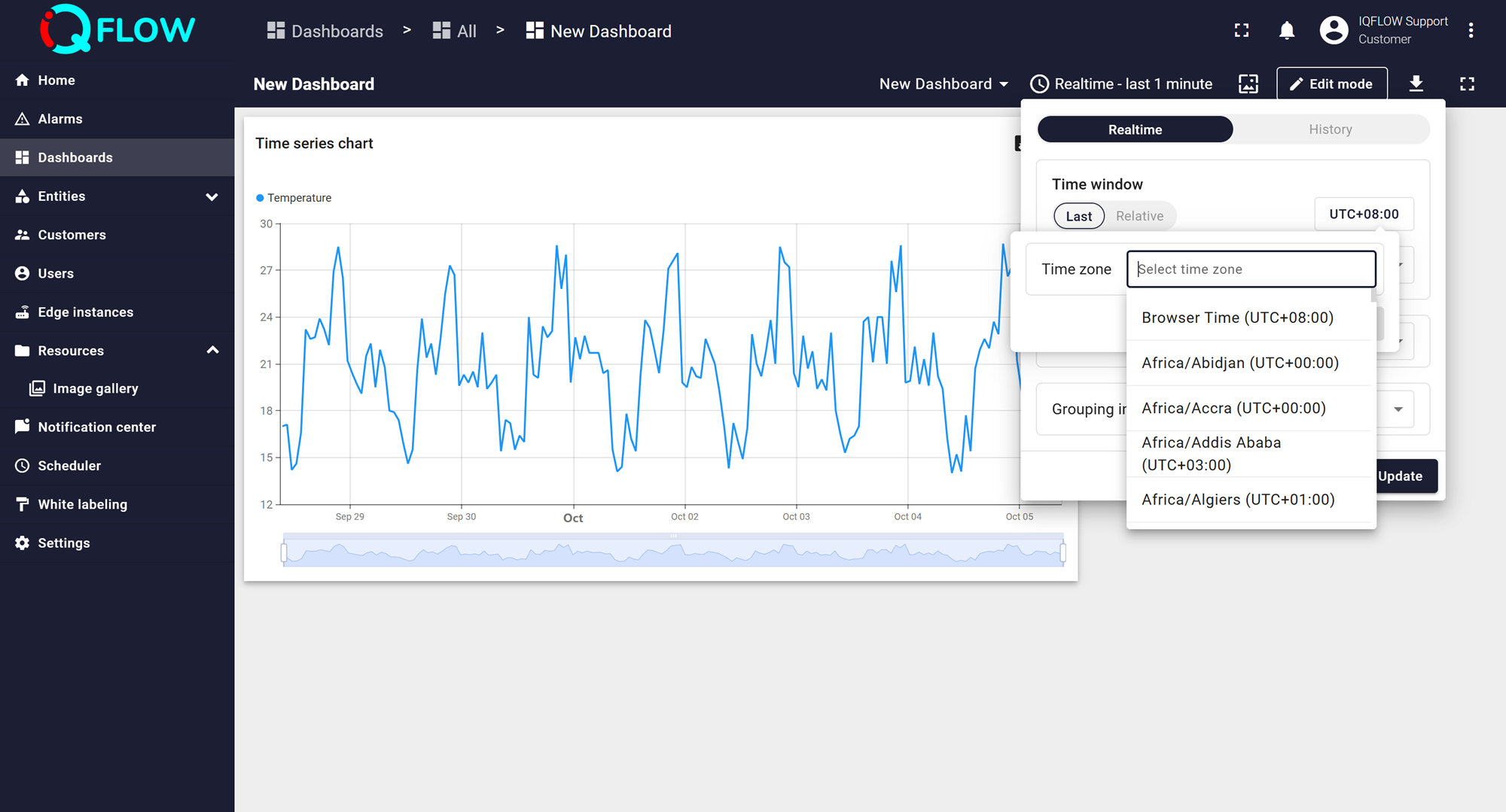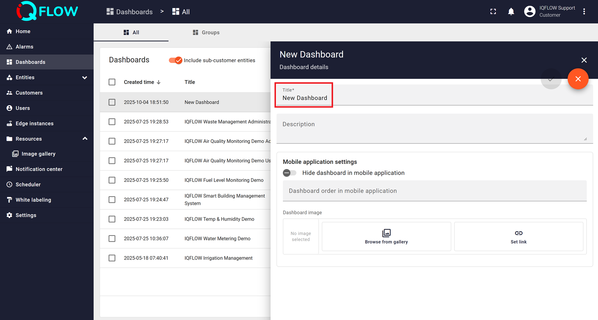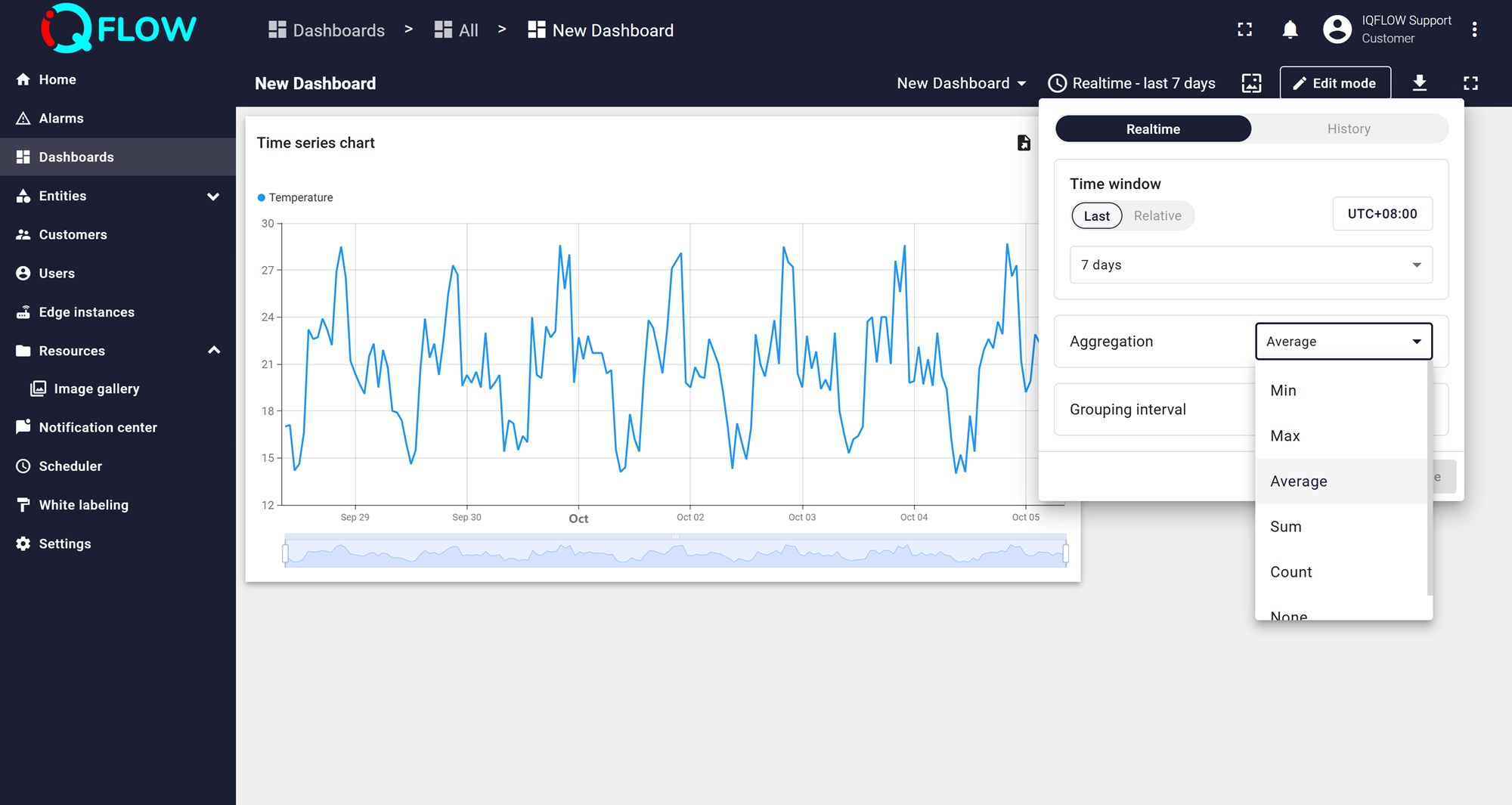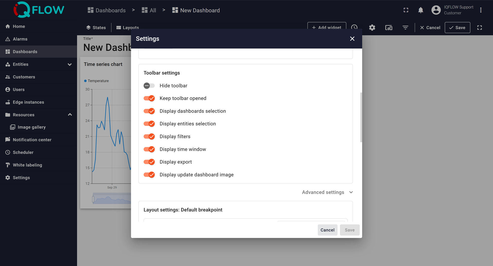IQFLOW offers a powerful feature – the ability to create and customise interactive visualisations, also known as dashboards. These dashboards are instruments for monitoring and managing your data and devices efficiently. With IQFLOW dashboards, users can adapt interfaces to their specific needs, making it easier than ever to inspect their IoT devices and data. What’s brilliant is that each dashboard can be populated with numerous widgets, offering flexibility and customisation. These dashboards aren’t limited to a single data source; they can display data from various entities, including devices, assets, and more. Plus, you can assign dashboards to specific customers, ensuring that the right individuals or teams have access to the data they need.