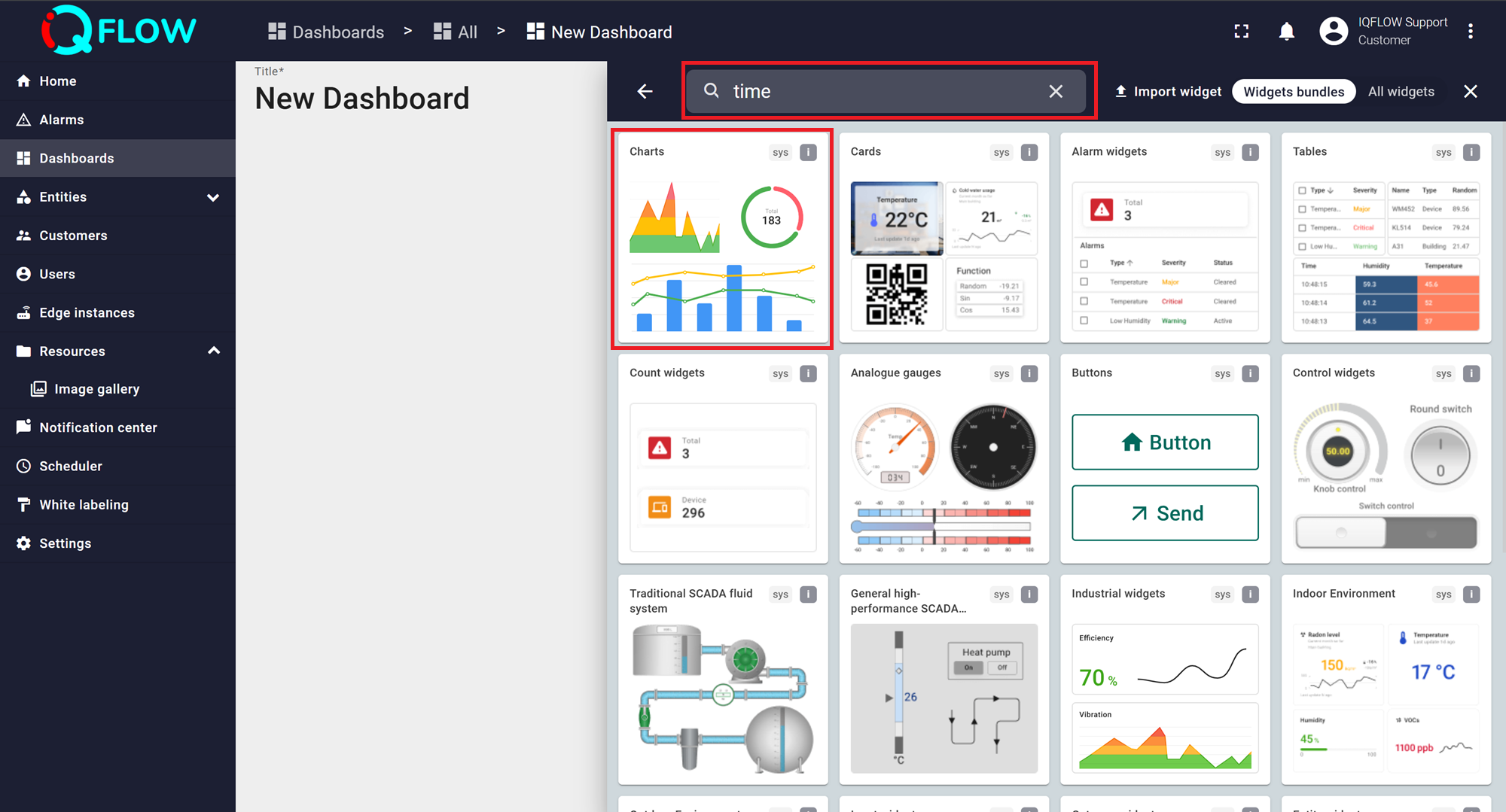 Choose the desired widget type from the available options, for example by searching "time" for Time series chart.