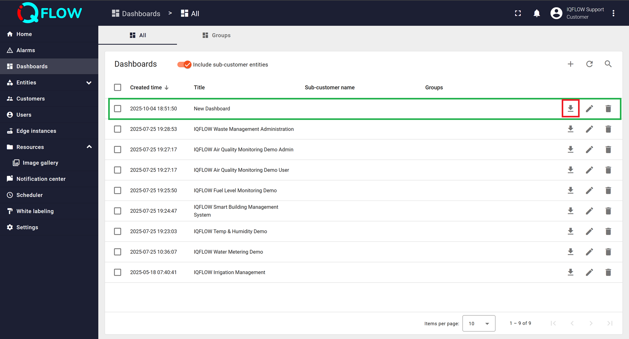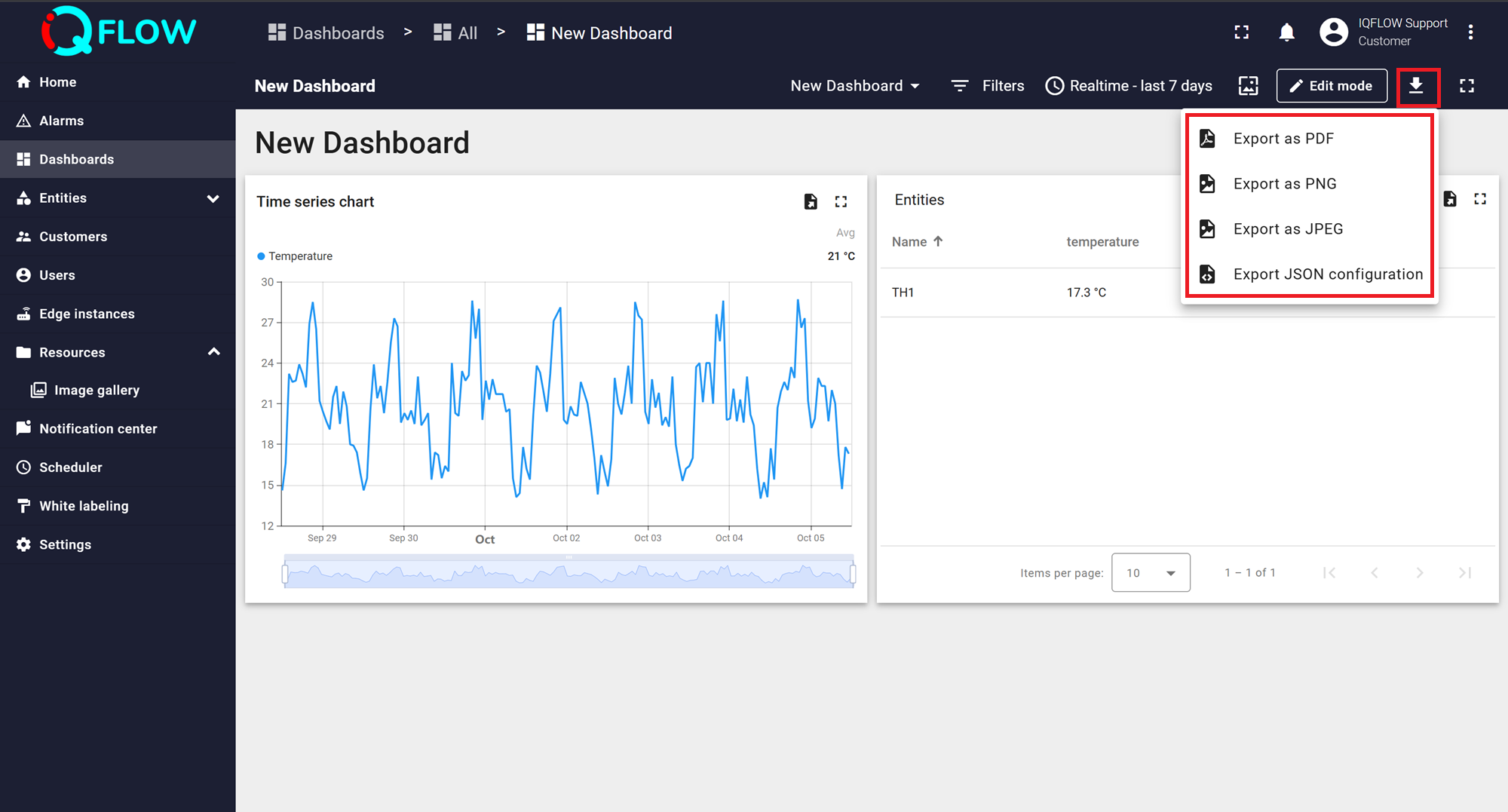 In the IQFLOW you can export a dashboard as a configuration file in JSON format. You can use this file to transfer your Dashboard or widget configuration to another instance.