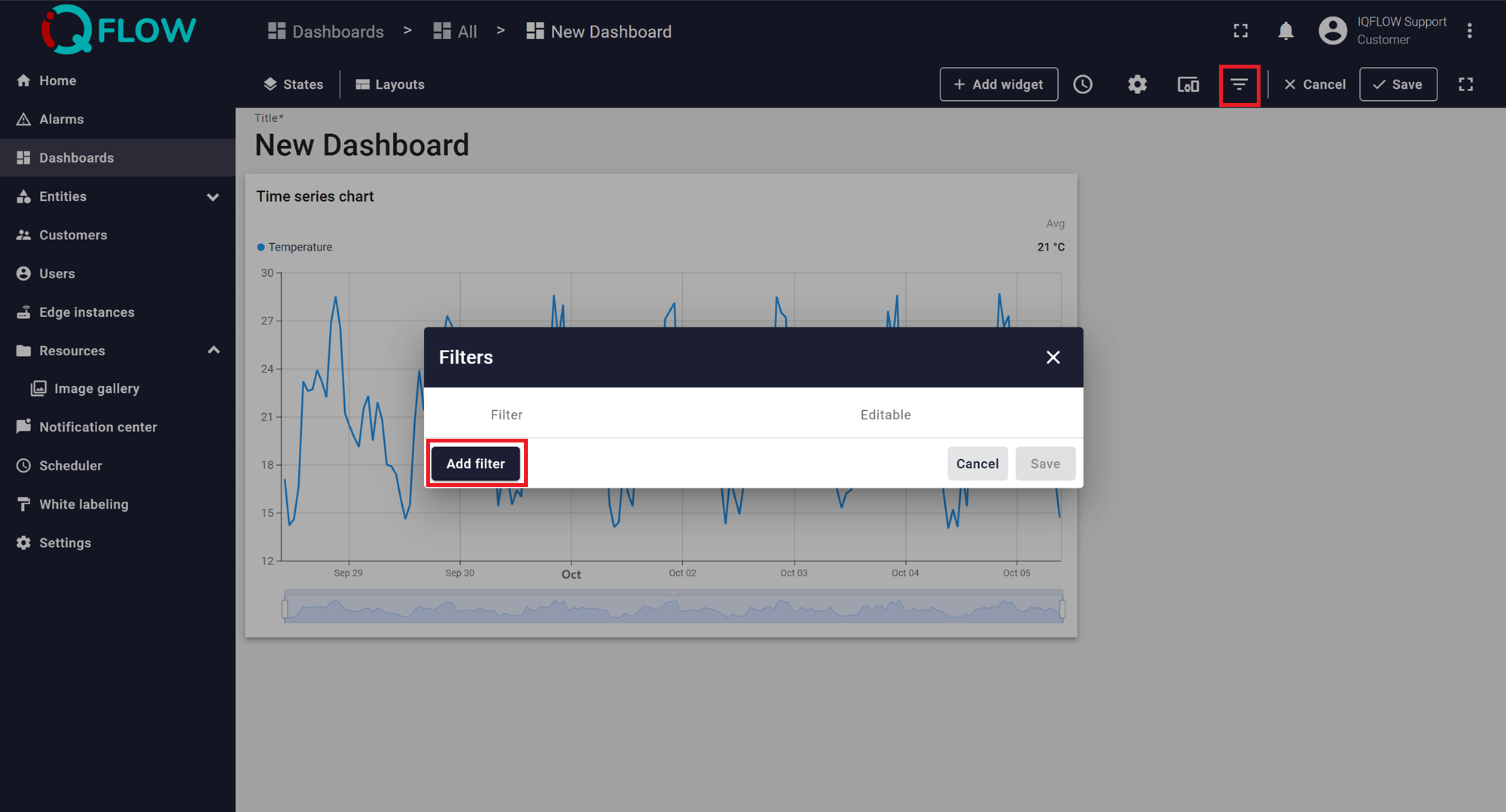 - Open your dashboard, enter edit mode and click the "Filters" button in the upper right corner of the dashboard window. In the pop-up window click "Add filter" button;