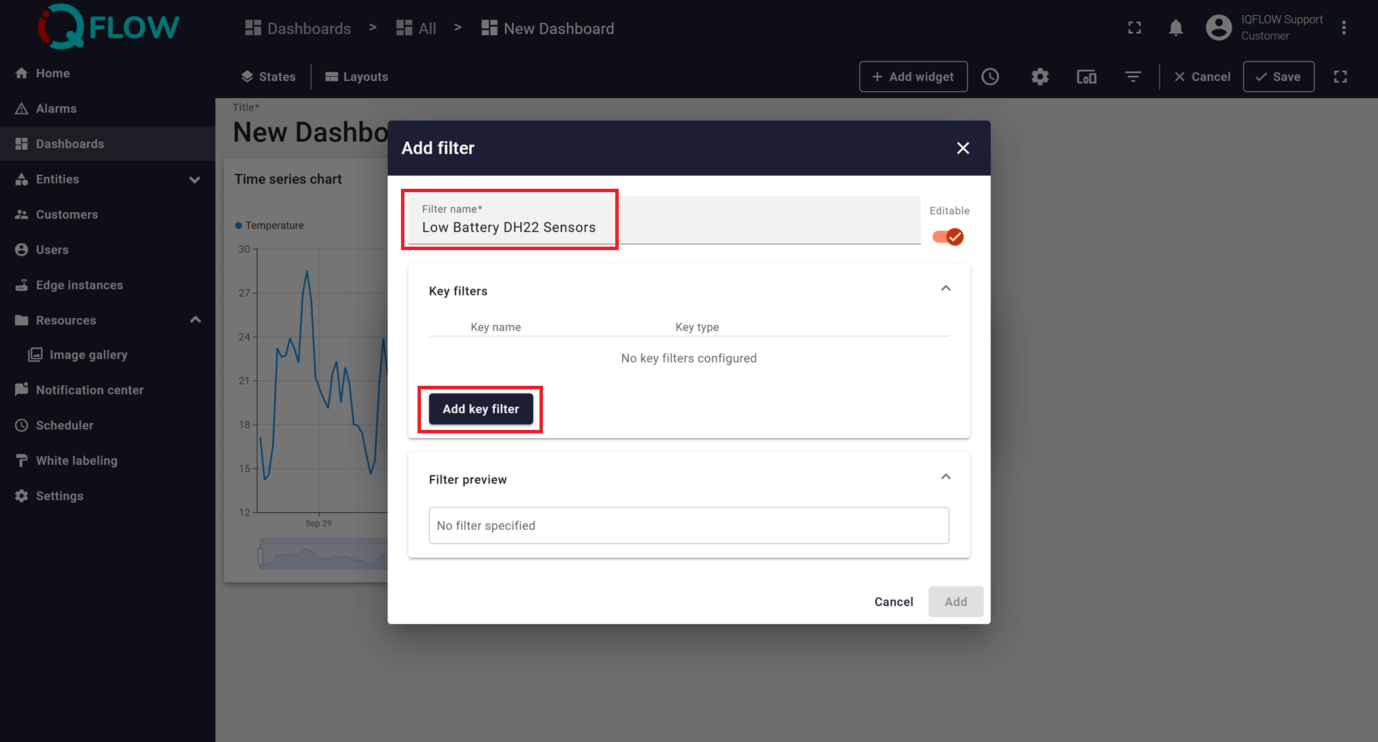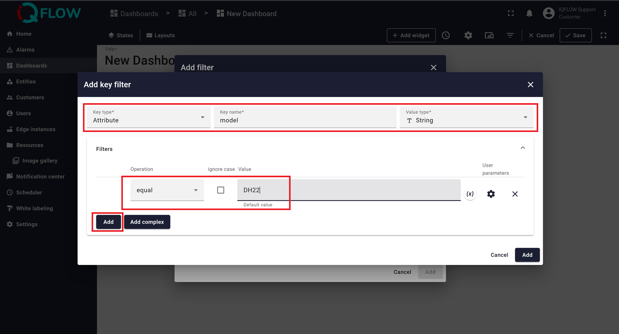 - Enter key name, select key type and value type. Then add a filter that checks if the sensor model is "DHT22" and click "Add";