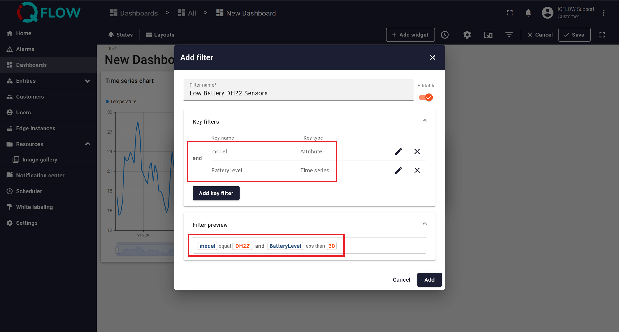 Let’s look at an example. Suppose you have thousands of “Thermometer” devices, and you would like to display thermometers of a specific model and with certain battery levels. Let’s also assume that thermometer model is stored as an attribute, and the battery level is stored as a time series data. We will define a filter that checks if the sensor model is “DHT22” and the battery level is less than 20 percent.