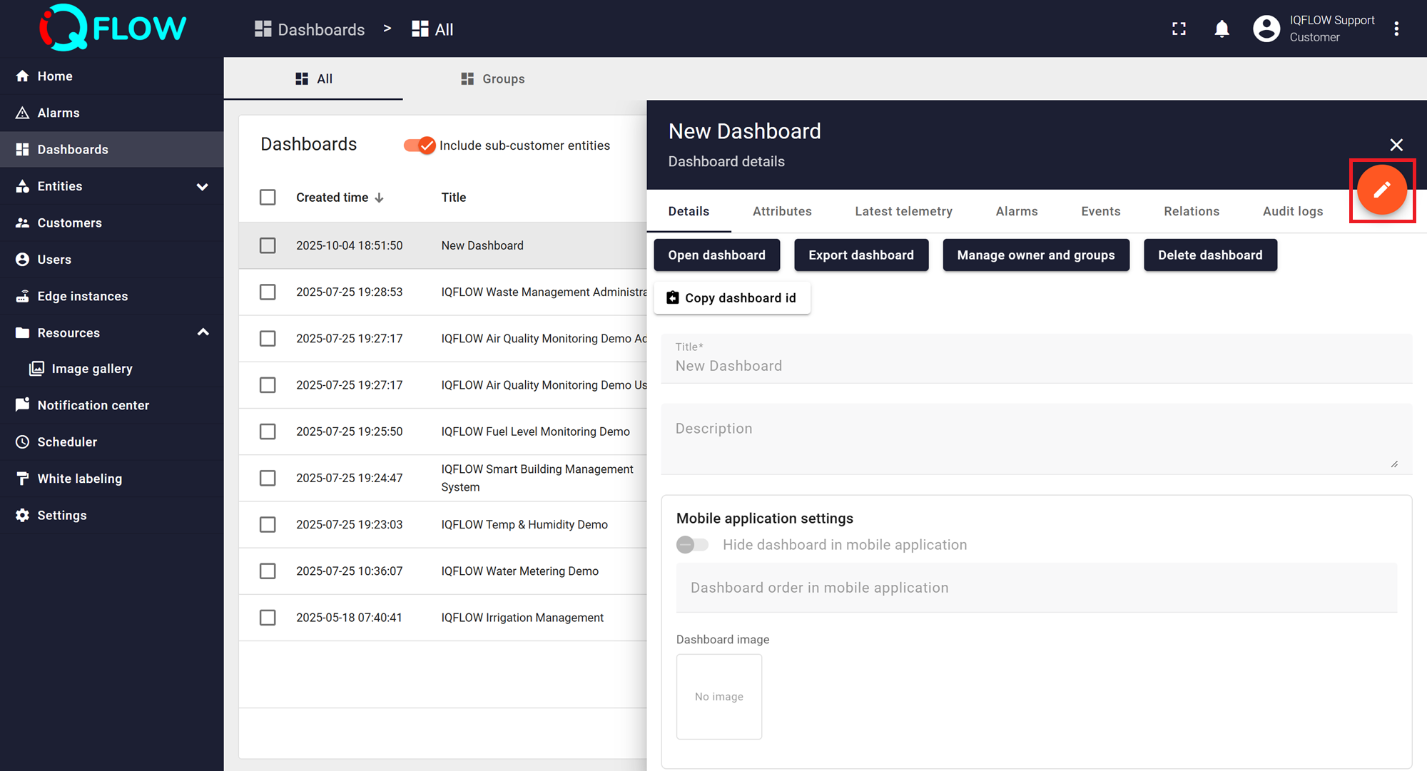 - Open the dashboard details by clicking the “pencil” icon in the dashboard list.