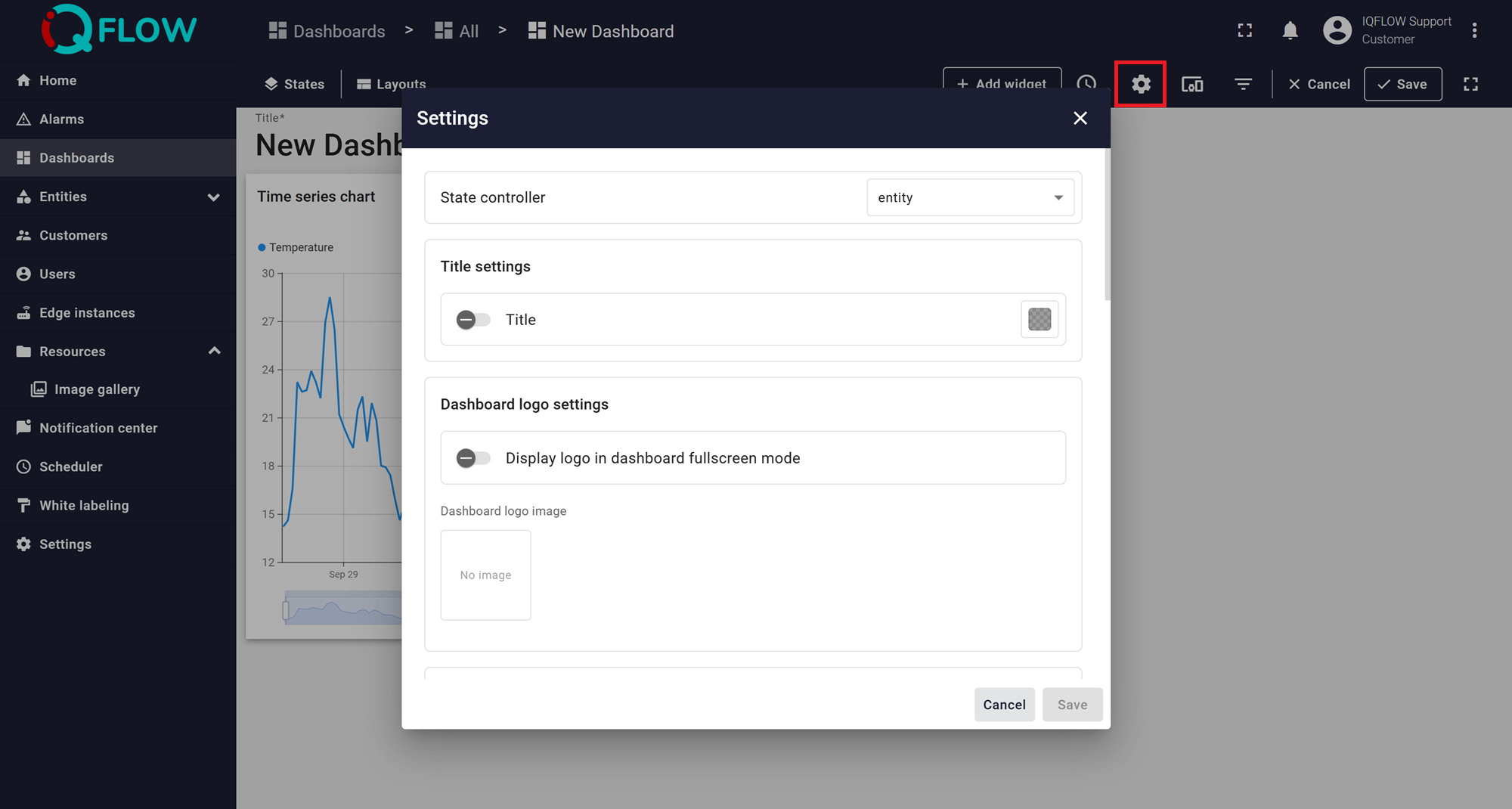 To start customising the Dashboard enter Edit mode, then click the “gear” icon in the upper right corner of the dashboard window to open the dashboard settings window.