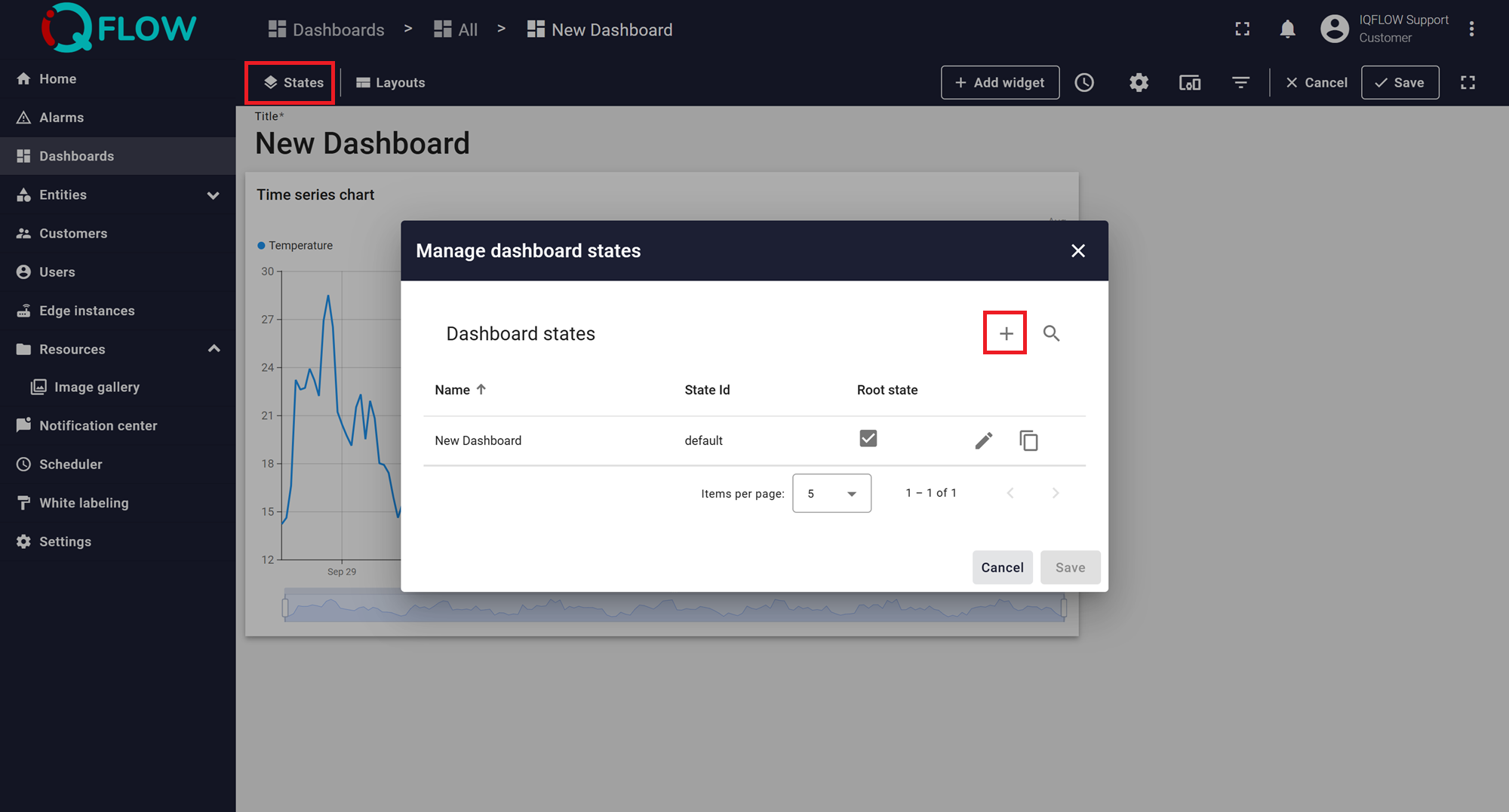 To add a new state, you need to click on the “+” icon in the right upper of the window, it will open the Add dashboard state window. Assign a name, and the State ID will automatically generate based on that name, though you have the option to modify it. Click “Add” and then save all changes.