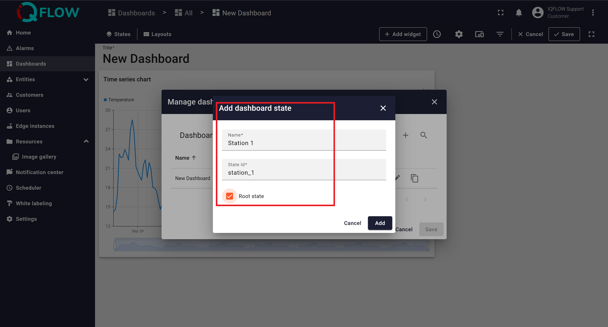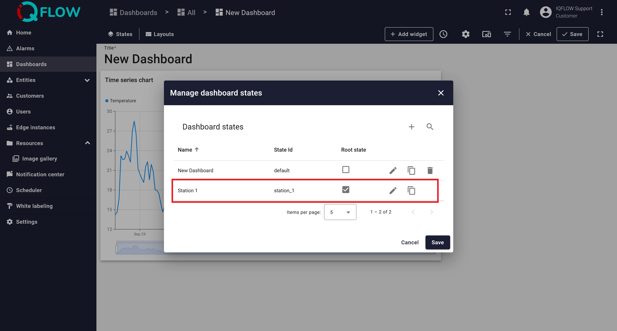 Since you haven’t created any states yet, you have only your “Root state”, namely your Dashboard. Root state defines the main state of your hierarchy. After creating additional states, you easily can change a root state by clicking the “Pencil” icon (Edit dashboard state) and selecting the “Root state” checkbox.