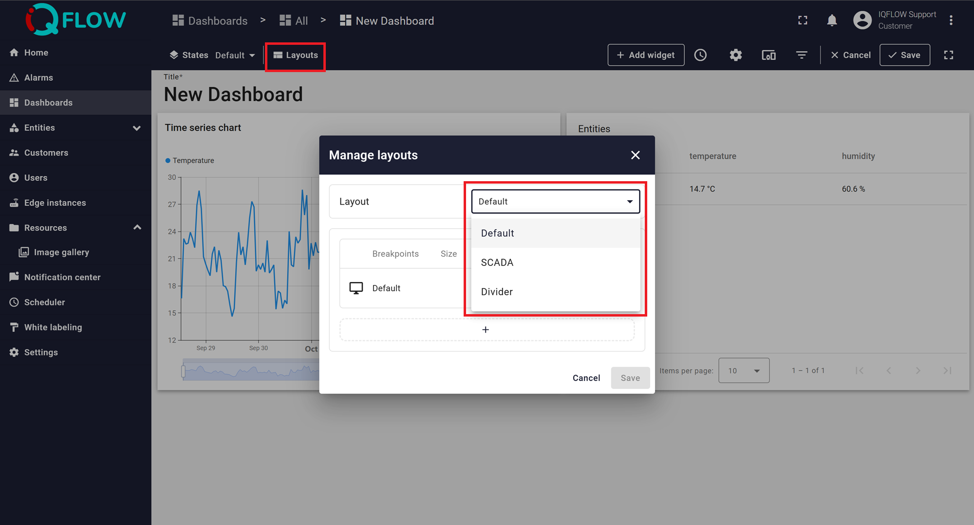 Dashboard layouts organise how widgets appear on the dashboard grid. Each dashboard state can have its own layout type, settings, and breakpoints, which helps create tailored visual presentations for different IoT use cases and screen resolutions.