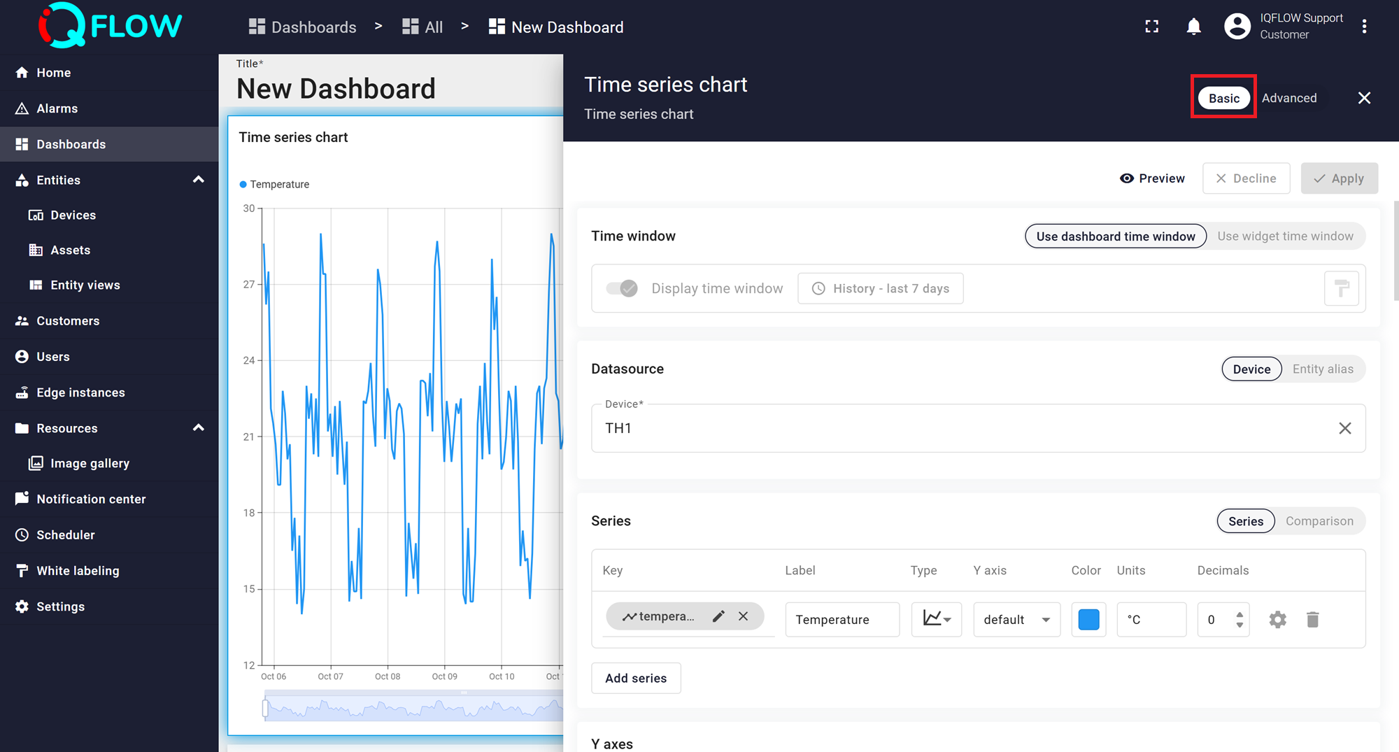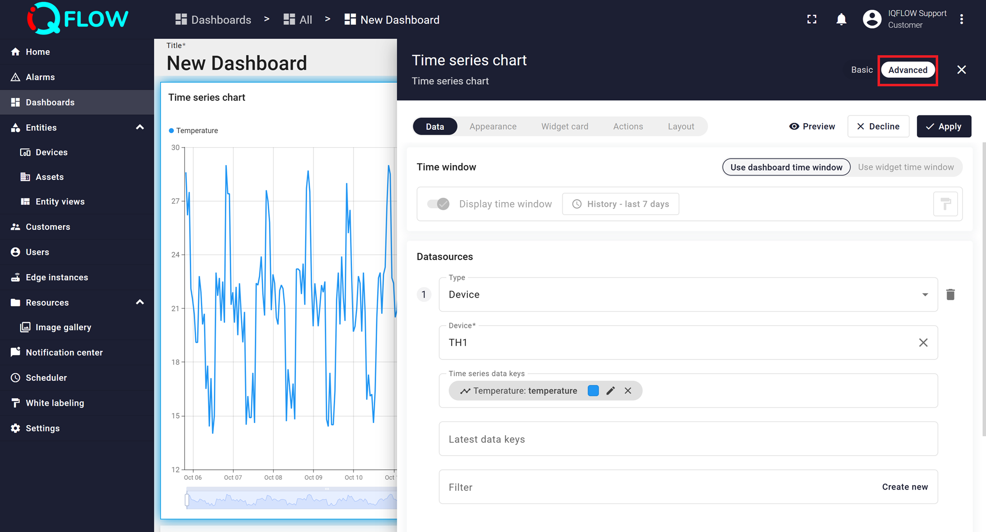 When creating a widget, you can switch between Basic and Advanced modes using the toggle in the top‑right corner of the widget dialog.