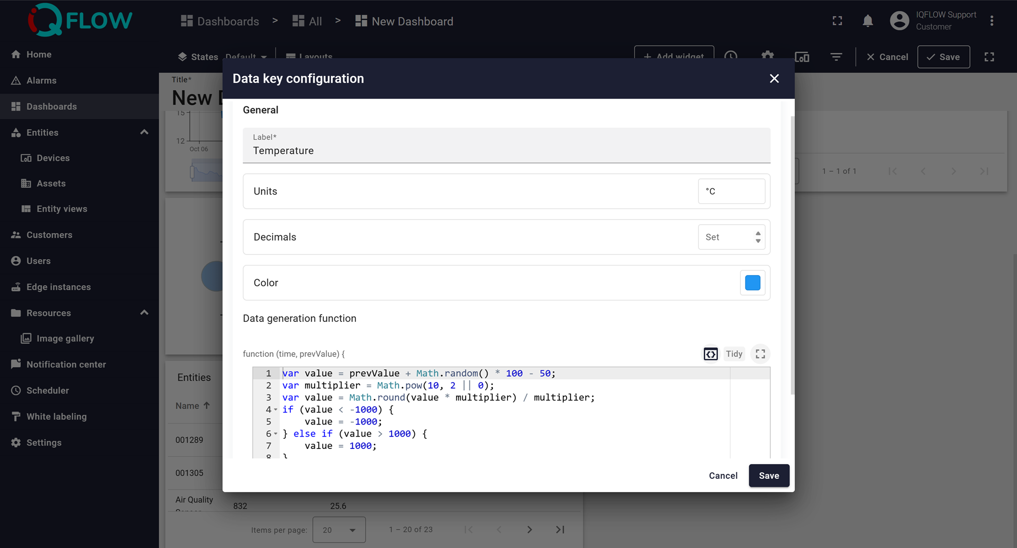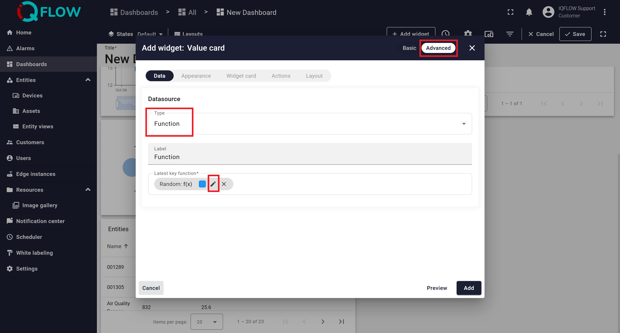 - The "Add Widget" dialog window will open. Navigate to the advanced functionality and select data source type - "Random". Then add a function - "Random" and click the "pencil" icon of the "Random" key to open data key configuration window;