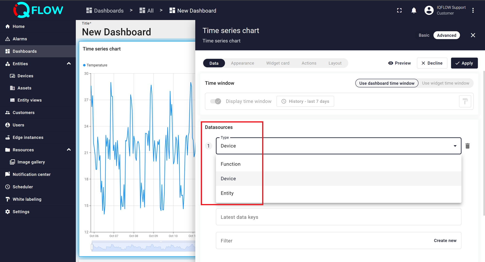 - Function — generate data (e.g., random) to preview a widget without live telemetry.