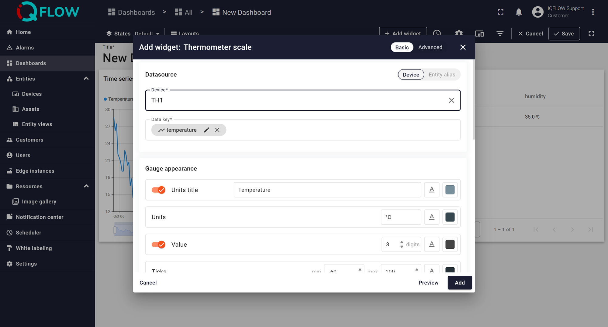 - The "Add Widget" dialog window will open. Select data source type - "Device" and select your device. Then add data key - "temperature". Click "Add" and save all changes; Thermometer scale widget is created.