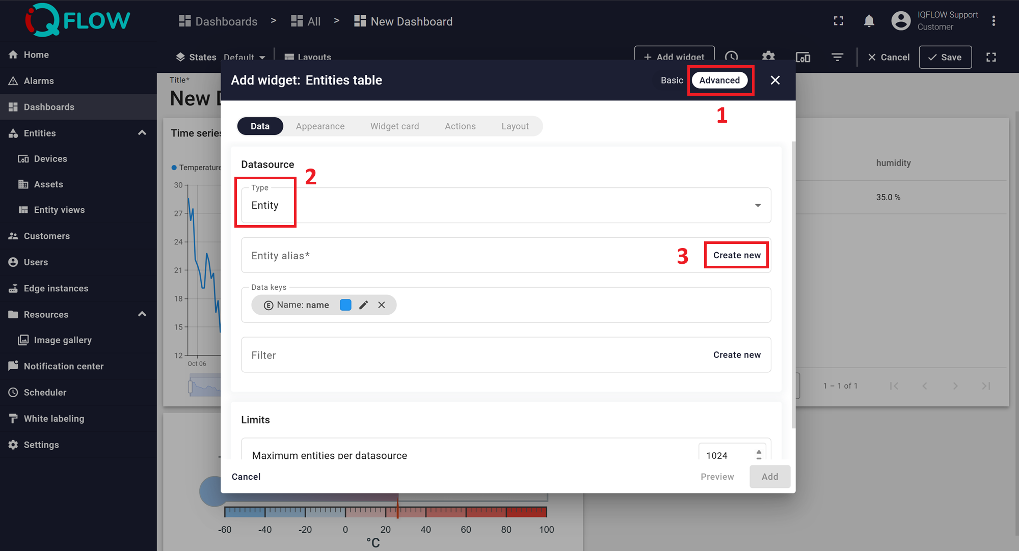 - The "Add Widget" dialog window will open. Select data source type - "Entity". Now, we need to create a new entity alias. Click "Create new" button in the entity alias row;