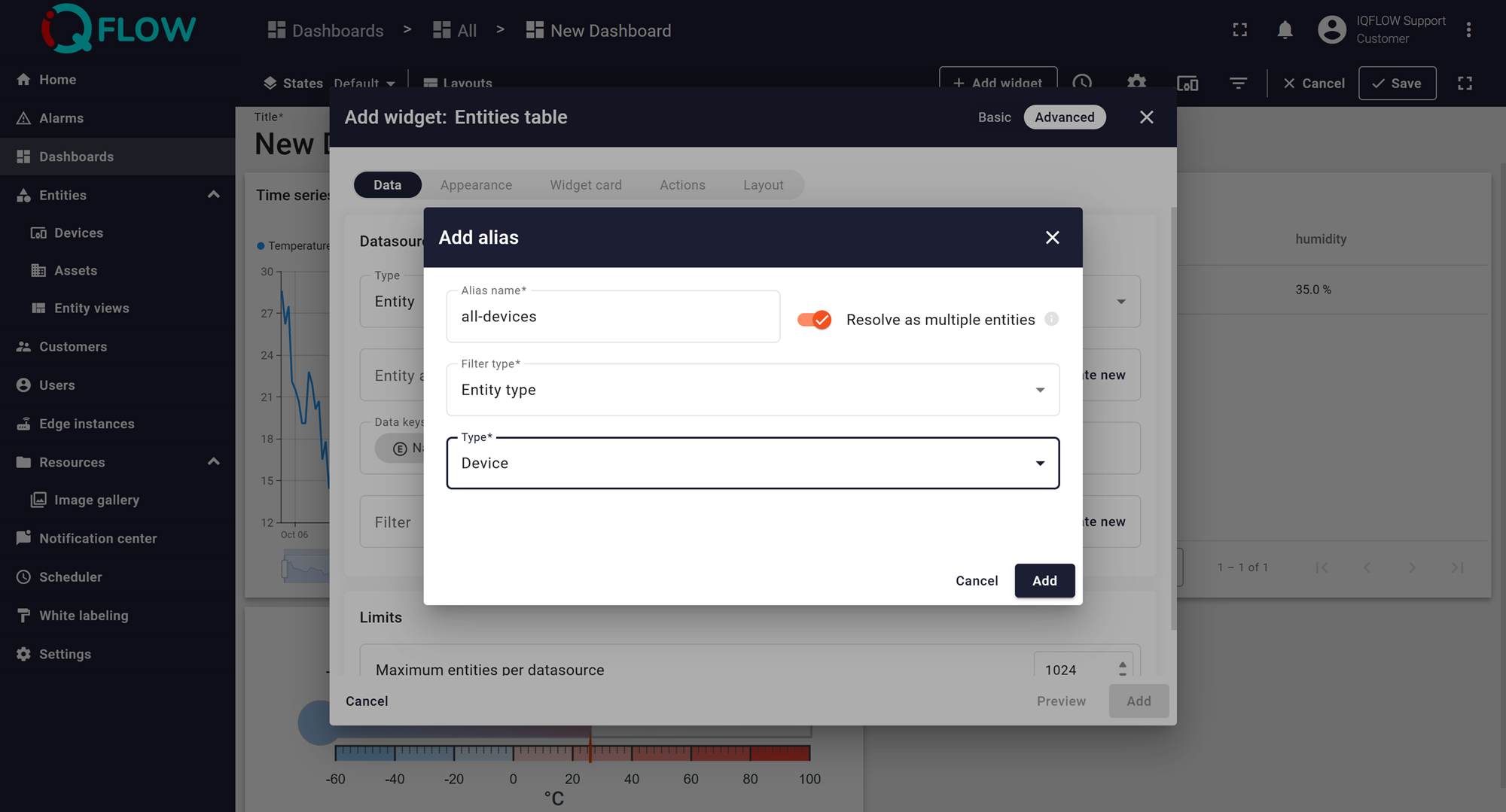 - In the opened Add alias dialog, enter an alias name, select filter type - "Entity type", and choose an entity type - "Device". Click "Add";